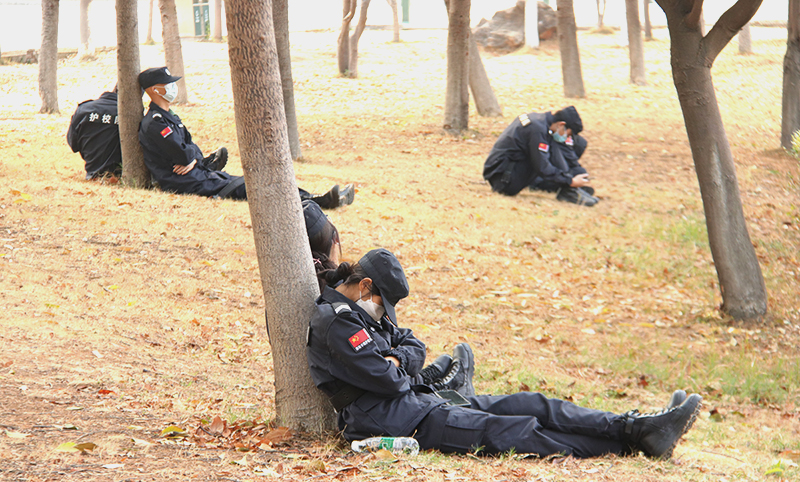 在疫情之初,他们的工作任务是围墙点位执勤。他们每天的工作是两班换班制,上午工作时间为7:00-14:00;下午工作时间为14:00-23:00,主要确保没有在校学生或外来人员翻墙进出学校或传递物品,及时劝导和拍照视频取证,分时段巡逻校园、定点位监查等方式对校园疫情防控行为进行纠治,致力于维护校园安全。