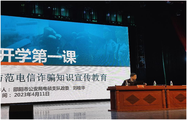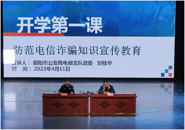 为进一步提升师生的反电诈安全防范意识,保障师生财产安全,使学生做到“不受骗,不参与”。4月11日至14日,学校联合邵阳市公安局电侦支队分别在李子园和七里坪校区面向6600余名师生共同开展2023年上学期防范电信网络诈骗主题教育活动。学校保卫工作部部长陈正贤,市公安局电侦支队政委刘桂华,反诈宣传民警,各二级学院党总支副书记、辅导员和2022级全体学生参加活动。